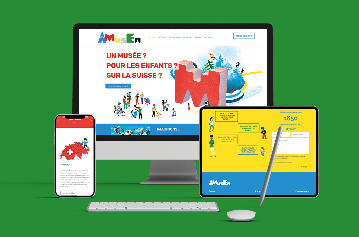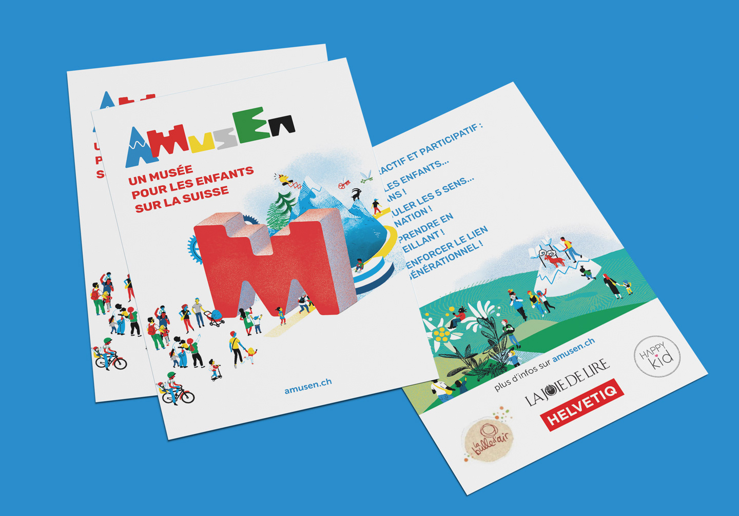 Refonte de l'identité graphique de l'AMusEn (Association pour un Musée des Enfants) à Genève. Déclinaison sur tous supports (site web, brochure reliée, flyer)